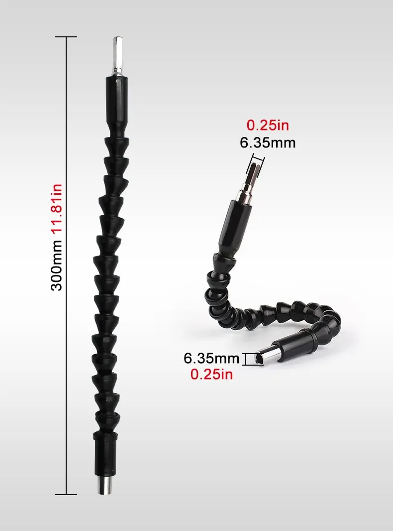 The size of the outer hexagon on one end of the 300mm black flexible shaft is 6.35mm, and the size of the inner hexagon on the other set is 6.35mm.